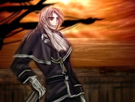 [天竜堂]天竜風雅さまへ---(2006.06.21) 天竜さんのオリジナル小説「Noble Blue」より、シャイン・グラヴェール。 -------私は艦長として、いかなる時も船を守る事を誓う 天竜さんご本人のイメージイラストの中にも、 船鐘の近くで海の夕風に一人で吹かれている彼の絵がありましたが、 海と孤独を愛するシャインの、そういう内省的なところが好きです。 今回は描けませんでしたが、海軍青の制服の裾からちらっと見える ブーツがまた素敵なのです。あれいいなぁ。