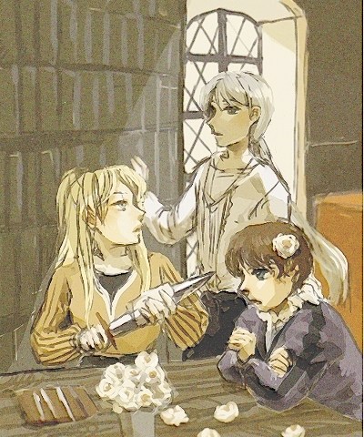 連載小説「ビスカリアの星」より、フラワン家の三きょうだい画を頂戴しました。