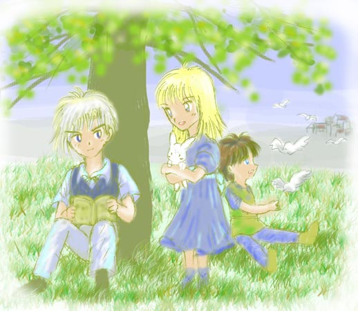 本を読んでいるシュディリスと、青いドレスのリリティス、寝転んで鳥と戯れているユスタス、