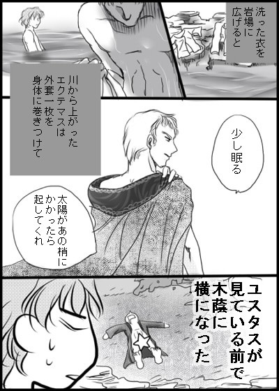 ■「ビスカリアの星」69話より一場面 >このシーンを読んだ時、普通に↑と思ったので。 とのこと。 そのわりには、ぱっと見てお分かりのように、 引用文章をきれいに無視して下さってます。 エクテマス、身体に外套を巻きつけてないです。 何が描きたかったんだろうとしばし迷うところです。 普通に何を思ったのかも謎です。 真ん中のコマのエクテマスさんがカッコいいのでよしとします。 ありがとうございました。ありがとうございました。二度言いました(‘ス’)←合言葉